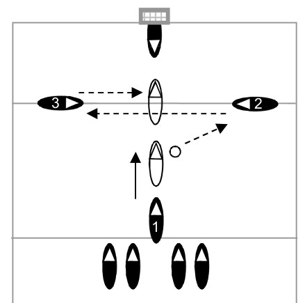 - Po strzale, (3) zajmuje pozycję bramkarza i blokuje następny strzał. Po bloku (3) odchodzi na bok.
