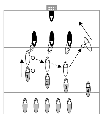 - Bramkarz (1) wykonuje podanie do (2). Po podaniu, (1) przemieszcza się na pozycję (2) gotowy na kolejne podanie wyjściowe.